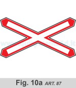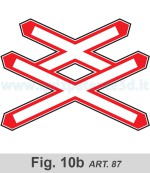 2. Il segnale di PASSAGGIO A LIVELLO SENZA BARRIERE (fig. II.9) deve essere usato per presegnalare ogni attraversamento ferroviario privo di barriere. Nelle immediate vicinanze dell'attraversamento deve essere apposto il segnale CROCE DI S. ANDREA (fig. II.10/a) che indica l'obbligo di fermarsi in corrispondenza dell'apposita striscia di arresto. Il segnale DOPPIA CROCE DI S. ANDREA (fig. II.10/b) indica che la ferrovia e' a due o piu' binari.