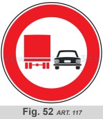 a) il segnale DIVIETO DI SORPASSO PER I VEICOLI DI MASSA A PIENO CARICO SUPERIORE A 3,5 t (fig. II.52). Indica il divieto di sorpassare veicoli a motore per i veicoli di massa a pieno carico superiore a 3,5 t, indicata sulla carta di circolazione e non adibiti a trasporto di persone. Il sorpasso dei veicoli non a motore e' consentito solo se la manovra puo' compiersi entro la semicarreggiata con o senza la striscia continua. La massa puo' essere diversamente definita dall'ente proprietario della strada e, in tale caso, il segnale deve essere dotato di pannello integrativo riportante il diverso valore;