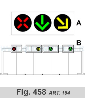 Non si trovano all’inizio di una galleria, nei passaggi a livello, nei ponti mobili o sui pontili d’imbarco delle navi traghetto. È sbagliato dire che valgono solo per i veicoli servizio di linea per trasporto di persone o per quelli circolanti sulle rotaie (tram e treni). Non vanno confusi con i semafori per corsie reversibili (fig. 458).