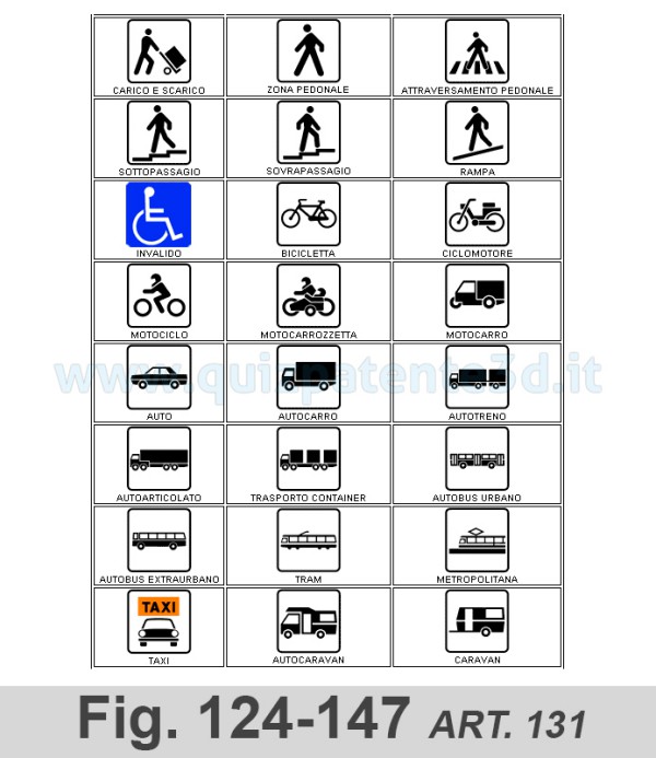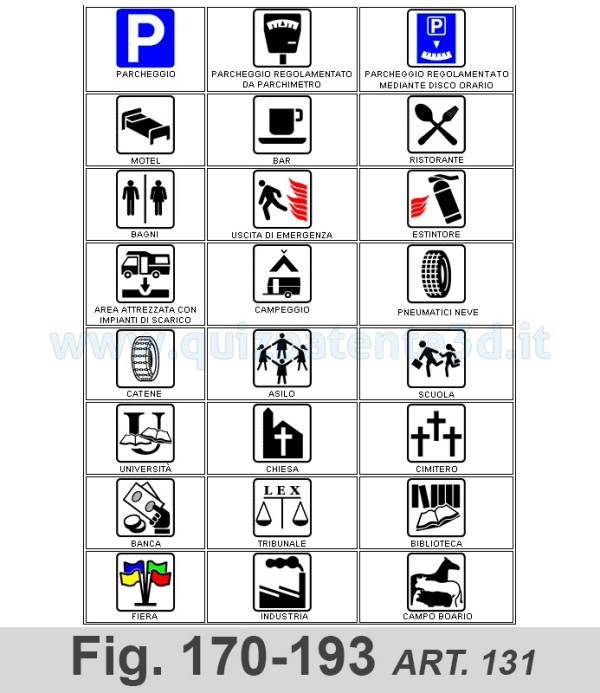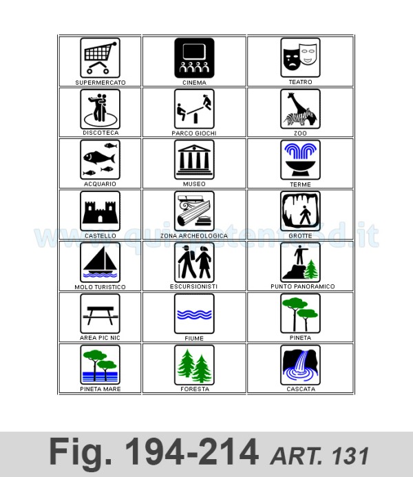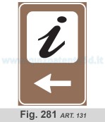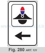 10. I segnali di cui al comma 9 sono posti perpendicolarmente all'asse stradale, all'altezza del punto segnalato e sono costituiti dal simbolo e da una freccia orizzontale rivolta verso l'ingresso. I simboli sono fissati nelle figure da II.100 a II.231. Le dimensioni sono le stesse di quelle dei segnali che indicano servizi di impianti utili (tab. II.8). Il colore del fondo e' bianco, con cornice e freccia nera (figure da II.277 a II.284).