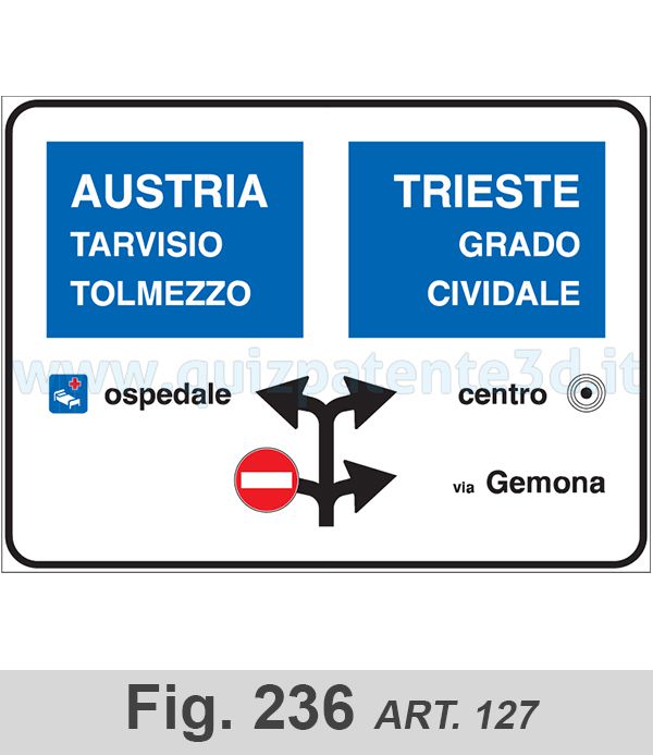 2. I segnali di preavviso di intersezione hanno forma rettangolare e contengono lo schema dell'intersezione, realizzato mediante frecce che possono avere spessore differente secondo la geometria e l'importanza delle strade, con i nomi delle localita' raggiungibili attraverso i vari rami dell'intersezione (figg. II.233, II.234, II.235).