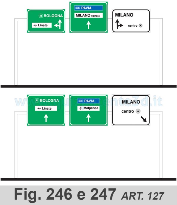10. Nel segnale di preselezione in corrispondenza di ogni corsia, la freccia sara' inserita nella parte inferiore ed una volta sola. La grandezza delle frecce deve essere proporzionata a quella del cartello e la loro altezza deve essere compresa tra 1/3 e 1/4 di quella del cartello (figg. II.246 e II.247).