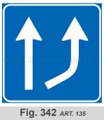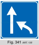 20. Il segnale VARIAZIONE CORSIE DISPONIBILI deve essere usato per segnalare una variazione del numero delle corsie disponibili nel senso di marcia in riduzione (figg. II.341 e II.343) ed in aumento (figg. II.342 e II.344). Le dimensioni sono le stesse del segnale di cui al comma 19. Il segnale di preavviso, costituito da analogo segnale completo di pannello modello II.1, deve essere impiegato quando la corsia abbia lunghezza superiore a 500 m e compatibilmente con le condizioni e caratteristiche della strada.