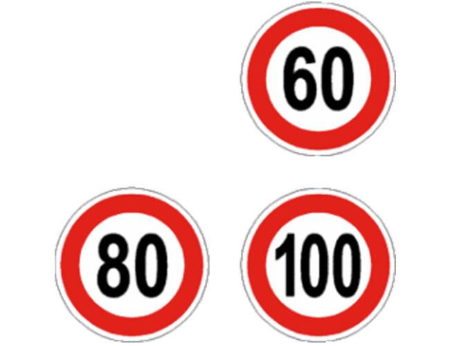 I contrassegni rappresentati in figura sono applicati sulla parte posteriore di alcune categorie di veicoli come, ad esempio, per alcuni autobus, autocarri, autotreni. Indicano le velocità massime consentite al veicolo sul quale sono applicati. Non sono applicati ai motocicli, autocarri ed autocaravan di massa complessiva fino 3,5 tonnellate.